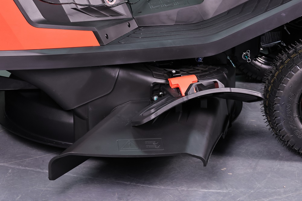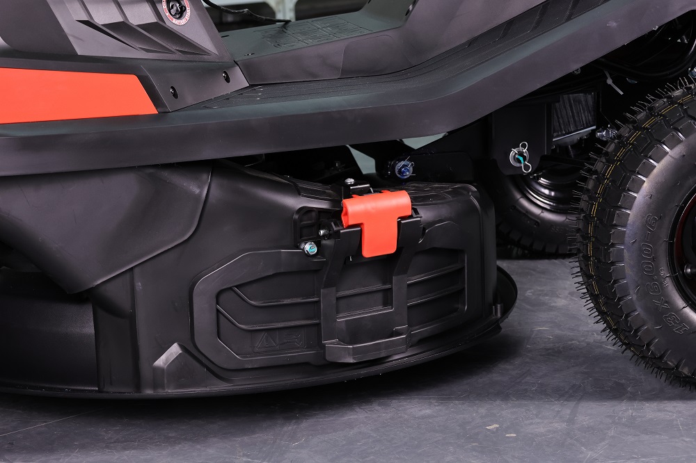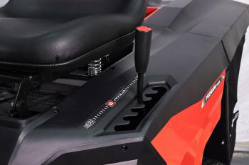 Sa transmission, disponible selon les versions en hydrostatique ou en mécanique, offre une conduite souple et agréable. L’utilisateur peut facilement gérer l’avancement, la vitesse et la marche arrière depuis le poste de conduite. Toutes les commandes essentielles – engagement de la lame, réglage du régime moteur, hauteur de coupe, frein – sont accessibles directement depuis le siège.